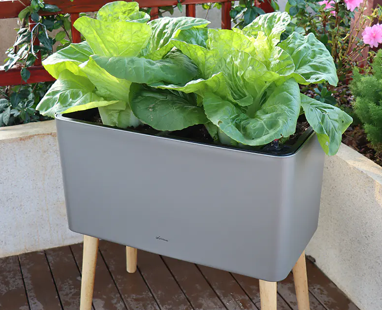 Las dimensiones internas de la jardinera permiten ambos enfoques. Las plantas más grandes, incluidos los arbustos pequeños o las plantas de follaje ornamental, pueden beneficiarse del volumen de suelo más profundo que favorece el crecimiento estable de las raíces. Al mismo tiempo, la disposición rectangular permite diseñar agrupaciones vegetales compactas.
